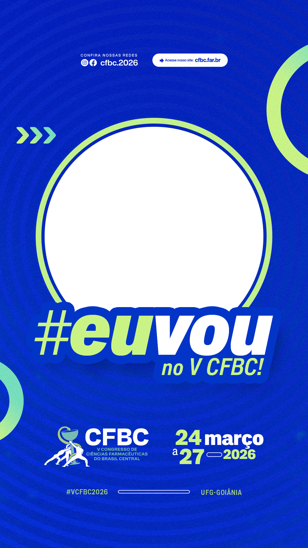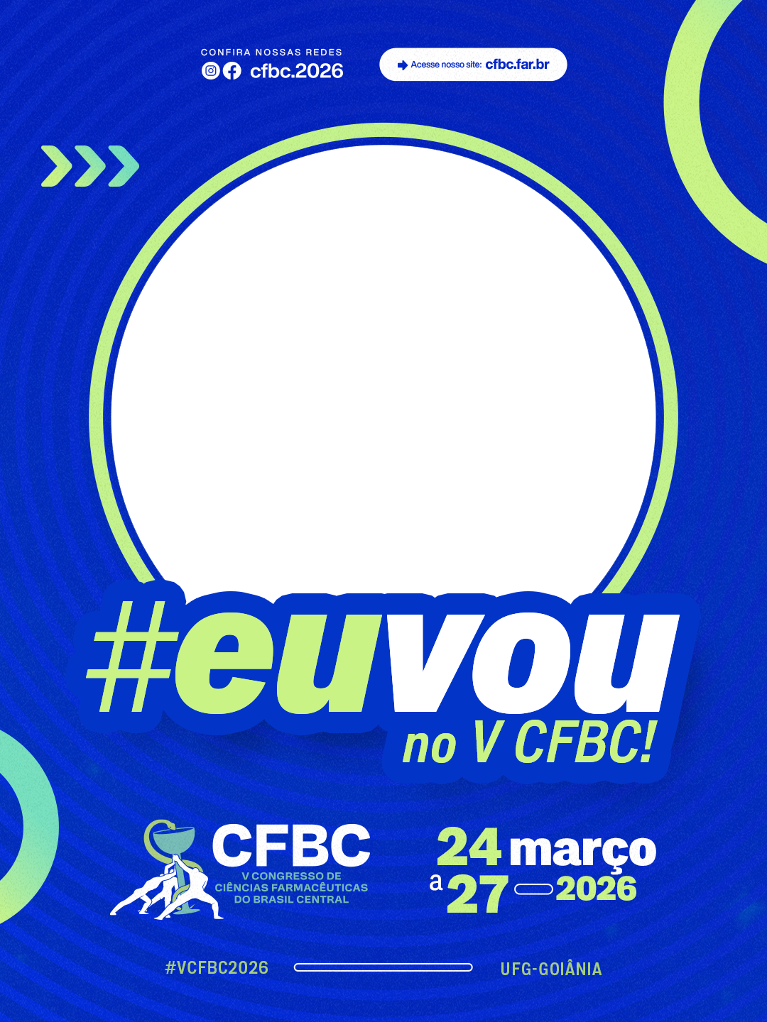 O maior congresso de Ciências Farmacêuticas do Brasil Central está chegando e você vai fazer parte disso! Baixe agora o seu filtro exclusivo #EuVouNoVCFBC, coloque sua foto e compartilhe nas redes sociais marcando o nosso perfil oficial: @cfbc.2026. Espalhe essa energia para a sua turma e ajude a construir a maior presença online do V CFBC!